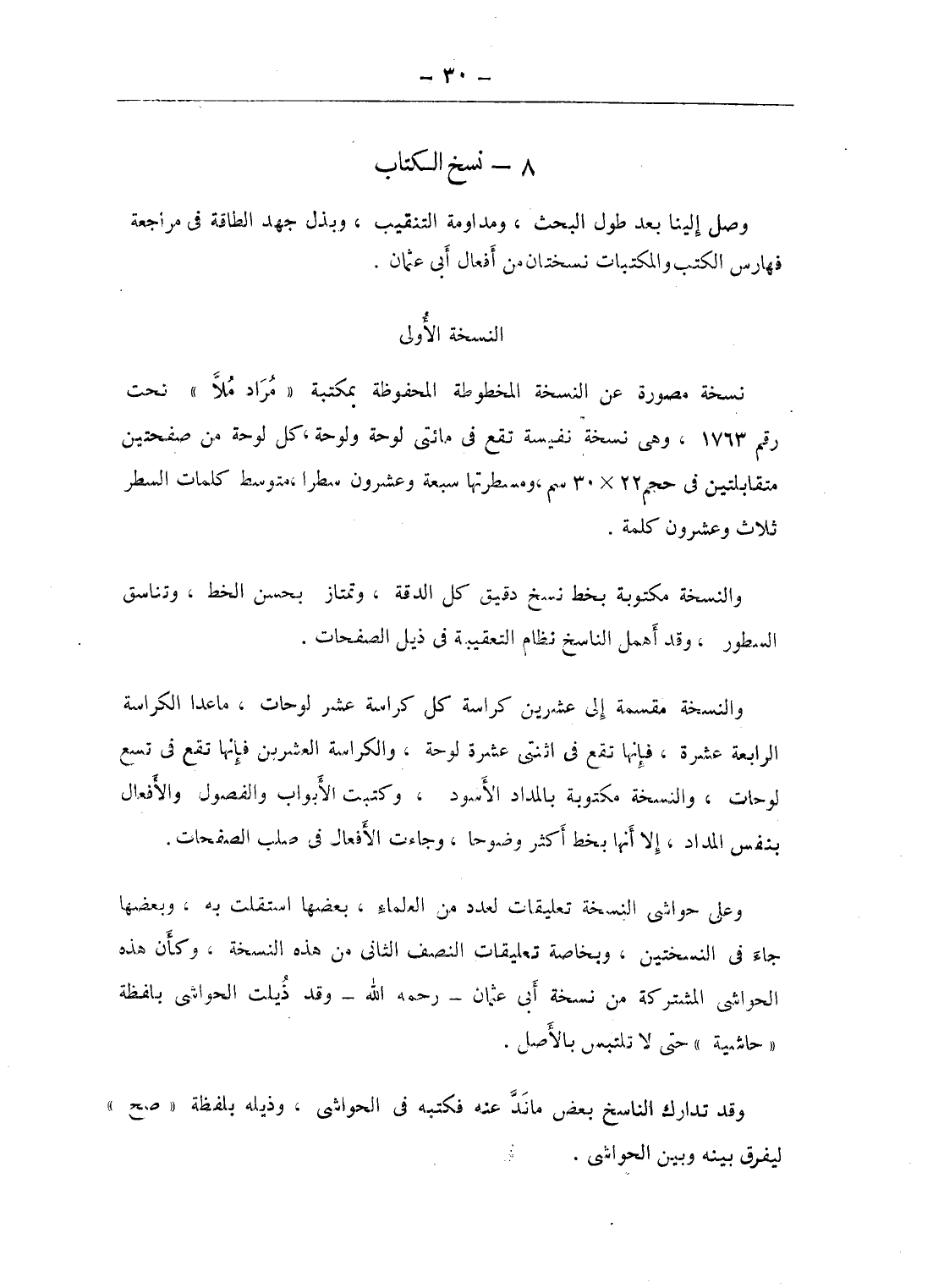 نسخة مصورة عن النسخة المخطوطة المحفوظة بمكتبة «مراد ملّا» تحت رقم 1763، وهى نسخة نفيسة تقع فى مائتى لوحة ولوحة، كل لوحة من صفحتين متقابلتين فى حجم 22 * 30 سم، ومسطرتها سبعة وعشرون سطرا، متوسط كلمات السطر ثلاث وعشرون كلمة.