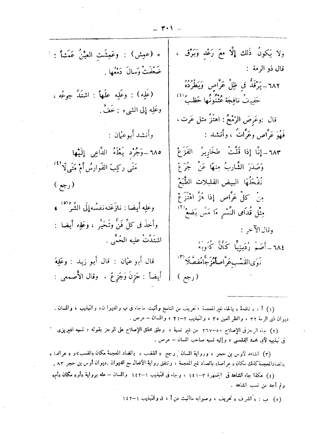 (¬3) الشاهد لأوس بن حجر، ورواية اللسان/ رجح «القضب» بالضاد المعجمة مكان «القسب» و «عراضا» بالضاد المعجمة كذلك مكان «عراصا» بالصاد غير المعجمة، وتتفق رواية الأفعال مع الديوان. ديوان أوس بن حجر 83.