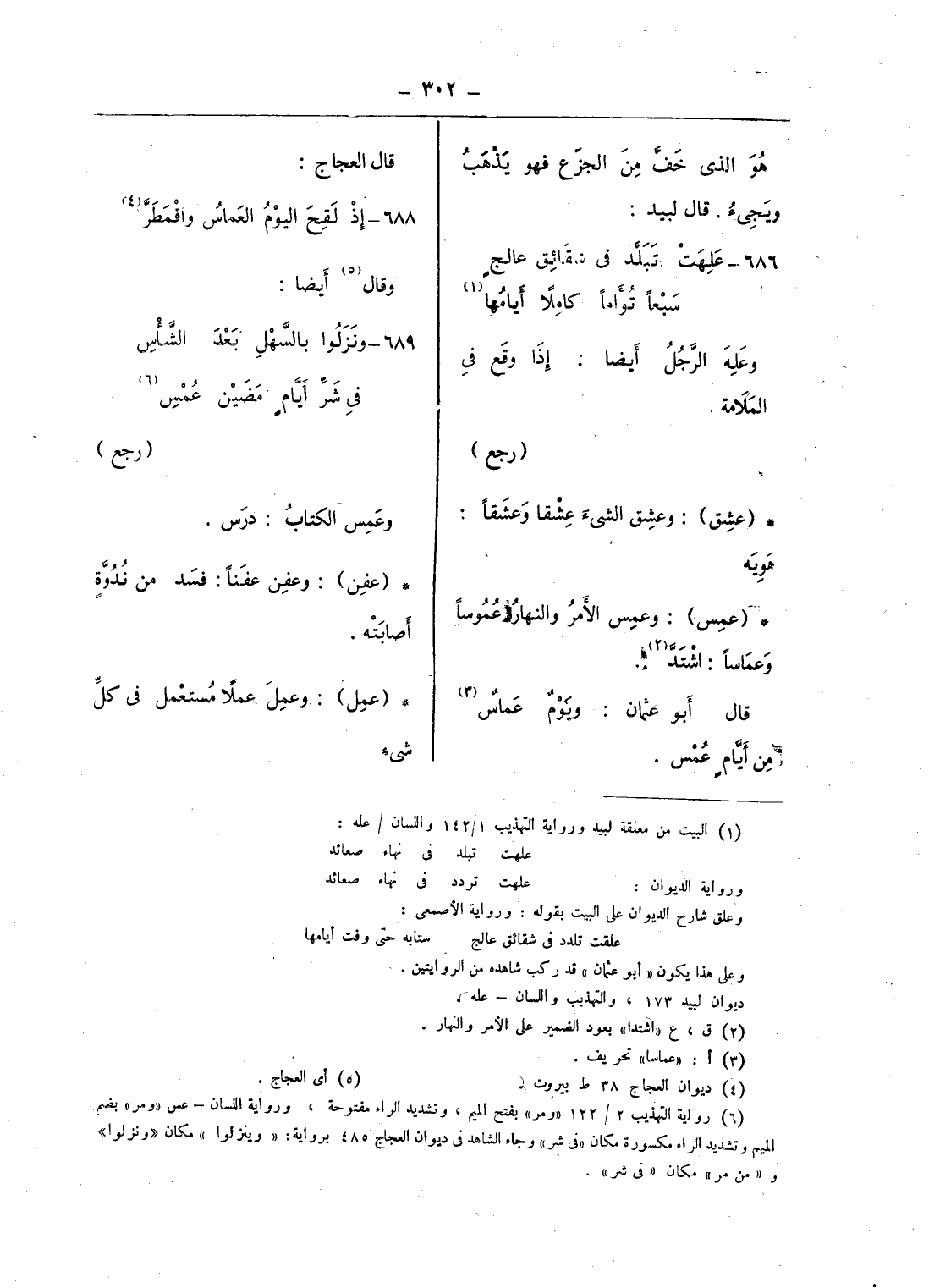 (¬6) رواية التهذيب 2/ 122 «ومر» بفتح الميم، وتشديد الراء مفتوحة، ورواية اللسان - عس «ومر» بضم الميم وتشديد الراء مكسورة مكان «فى شر» وجاء الشاهد فى ديوان العجاج 485 برواية: «وينزلوا» مكان «ونزلوا» و «من مر» مكان «فى شر».