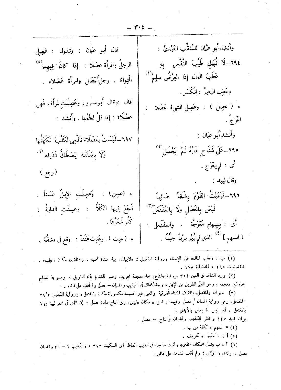 (¬3) الديوان «المقتعل» بالقاف المثناه الفوقية والعين غير المعجمة مكسورة مكان «المفتعل» ورواية التهذيب 2/ 29 «المفتعل» وهى رواية اللسان/ عصل وفيهما «لسن» مكان «ليس» وفى التاج مادة عصل: إن الذى فى شعر لبيد «ولا بالمفتعل» أى ليس ما يعمل بالأيدى.