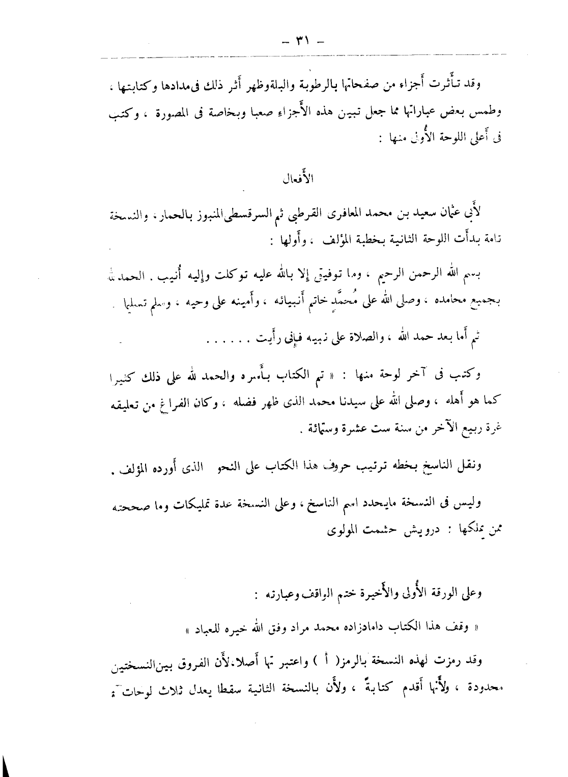 لأبى عثمان سعيد بن محمد المعافرى القرطبى ثم السرقسطى المنبوز بالحمار، والنسخة تامة بدأت اللوحة الثانية بخطبة المؤلف، وأولها: