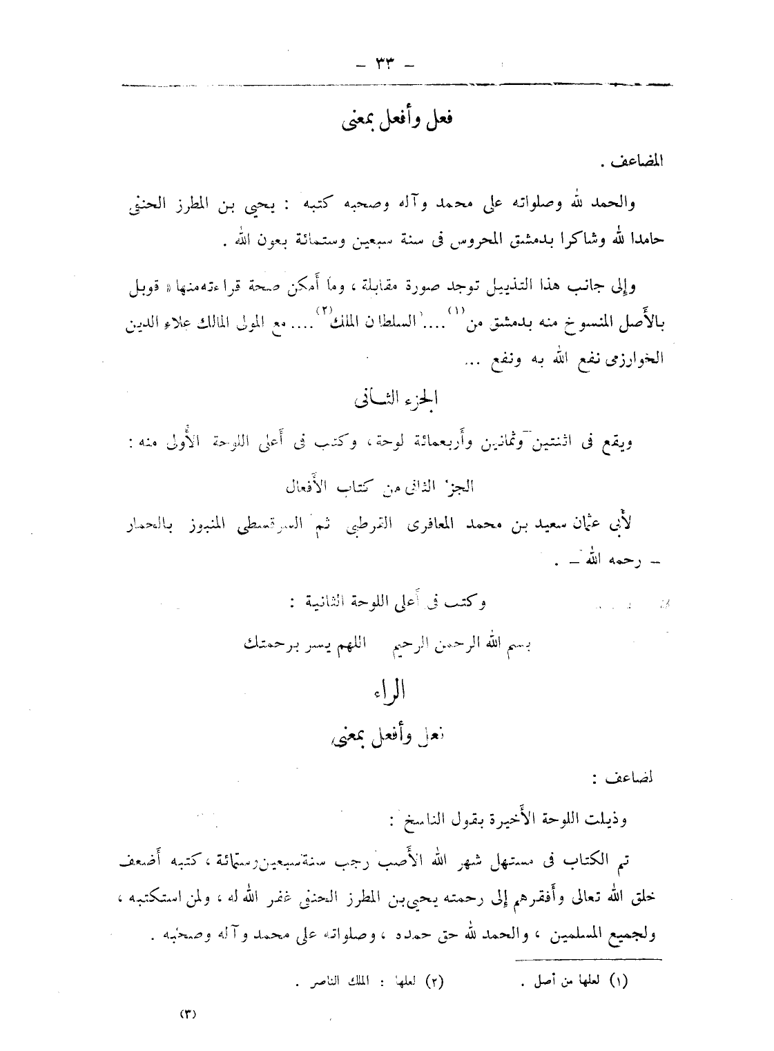 الجزء الثانى من كتاب الأفعال لأبى عثمان سعيد بن محمد المعافرى القرطبى ثم السرقسطى المنبوز بالحمار - رحمه الله -.