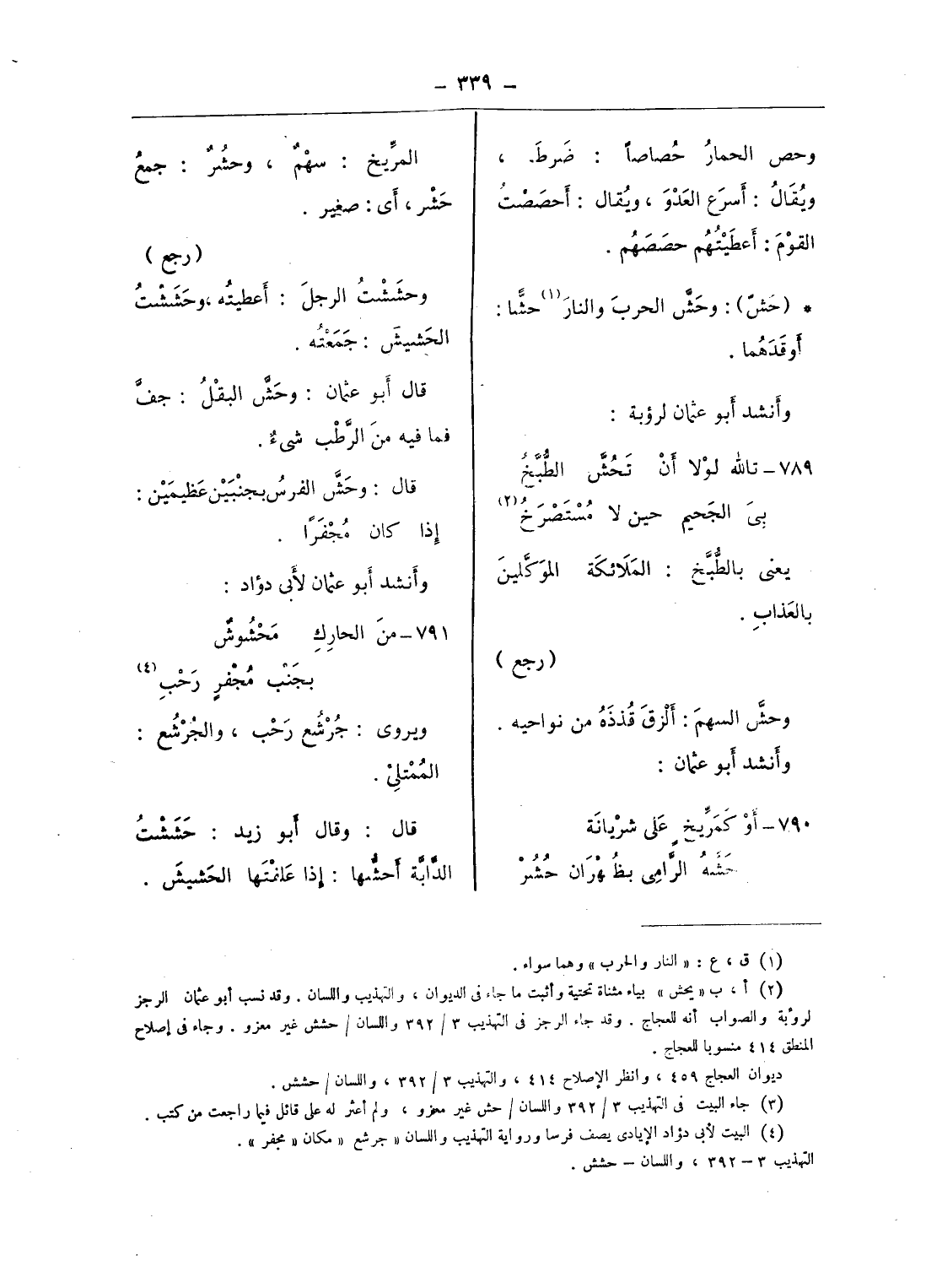(¬2) أ، ب «يحش» بياء مثناة تحتية وأثبت ما جاء فى الديوان، والتهذيب واللسان. وقد نسب أبو عثمان الرجز لرؤبة والصواب أنه للعجاج. وقد جاء الرجز فى التهذيب 3/ 392 واللسان/ حشش غير معزو. وجاء فى إصلاح المنطق 414 منسوبا للعجاج.