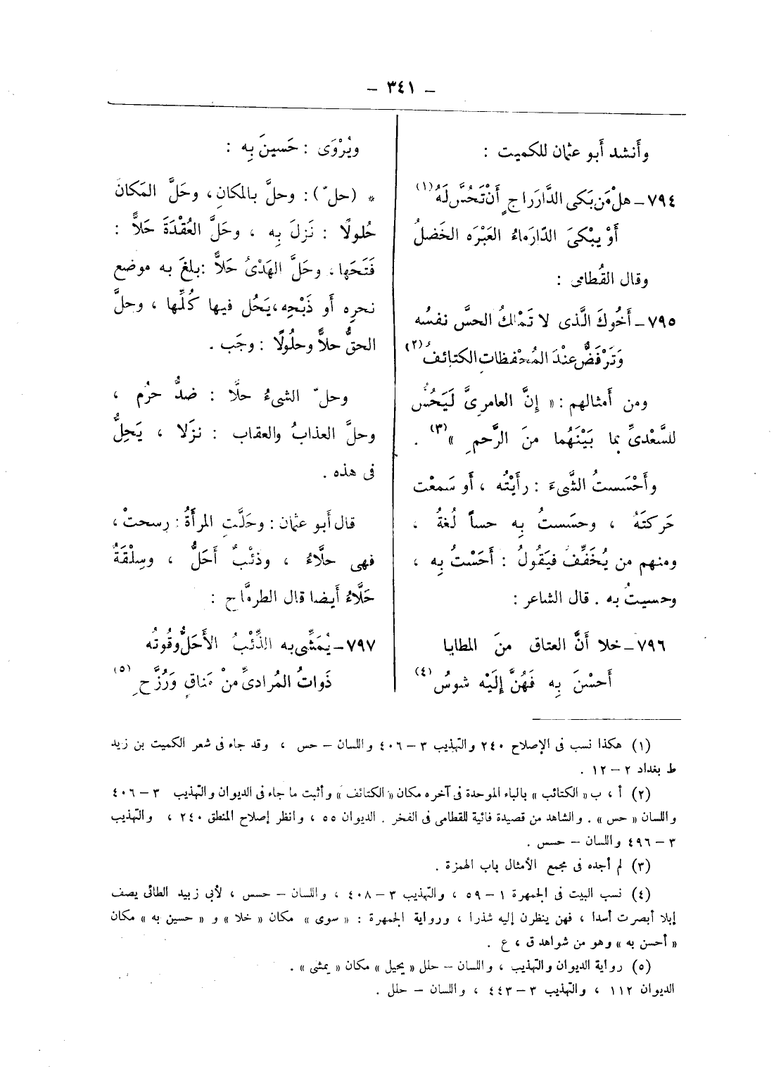 (¬1) هكذا نسب فى الإصلاح 240 والتهذيب 3 - 406 واللسان - حس، وقد جاء فى شعر الكميت بن زيد ط بغداد 2 - 12.