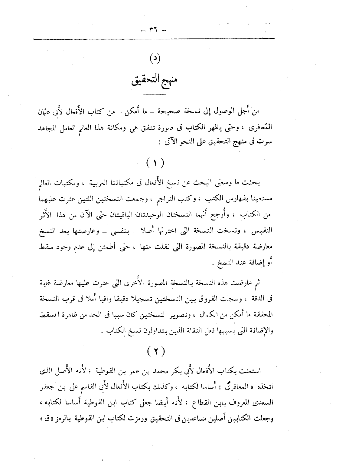 بحثت ما وسعنى البحث عن نسخ الأفعال فى مكتباتنا العربية، ومكتبات العالم مستعينا بفهارس الكتب، وكتب التراجم، وجمعت النسختين اللتين عثرت عليهما من الكتاب، وأرجح أنهما النسختان الوحيدتان الباقيتان حتى الآن من هذا الأثر النفيس، ونسخت النسخة التى اخترتها أصلا - بنفسى - وعارضتها بعد النسخ معارضة دقيقة بالنسخة المصورة التى نقلت منها، حتى أطمئن إلى عدم وجود سقط أو إضافة عند النسخ.