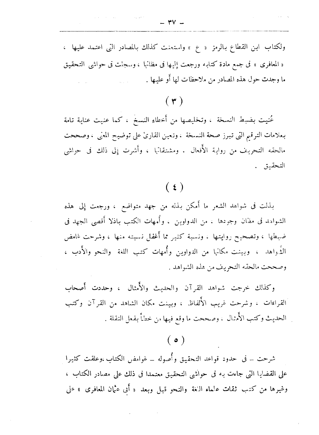 ولكتاب ابن القطاع بالرمز «ع» واستعنت كذلك بالمصادر التى اعتمد عليها، «المعافرى» فى جمع مادة كتابه ورجعت إليها فى مظانها، وسجلت فى حواشى التحقيق ما وجدت حول هذه المصادر من ملاحظات لها أو عليها.