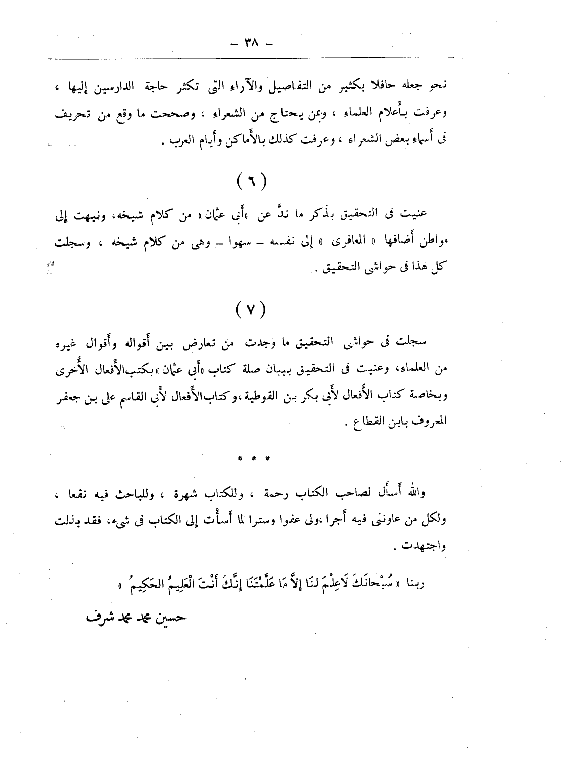 نحو جعله حافلا بكثير من التفاصيل والآراء التى تكثر حاجة الدارسين إليها، وعرفت بأعلام العلماء، وبمن يحتاج من الشعراء، وصححت ما وقع من تحريف فى أسماء بعض الشعراء، وعرفت كذلك بالأماكن وأيام العرب.