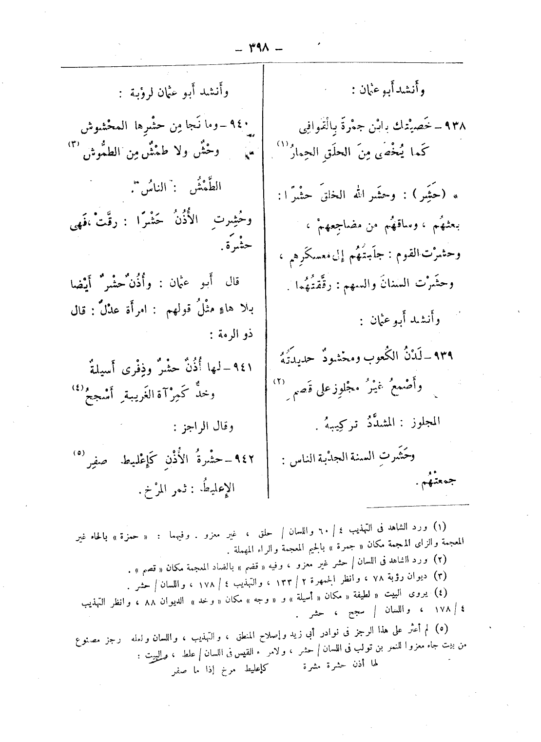 (¬5) لم أعثر على هذا الرجز فى نوادر أبى زيد وإصلاح المنطق، والتهذيب، واللسان ولعله رجز مصنوع من بيت جاء معزوا للنمر بن تولب فى اللسان/ حشر، ولامرء القيس فى اللسان/ علط، والبيت: