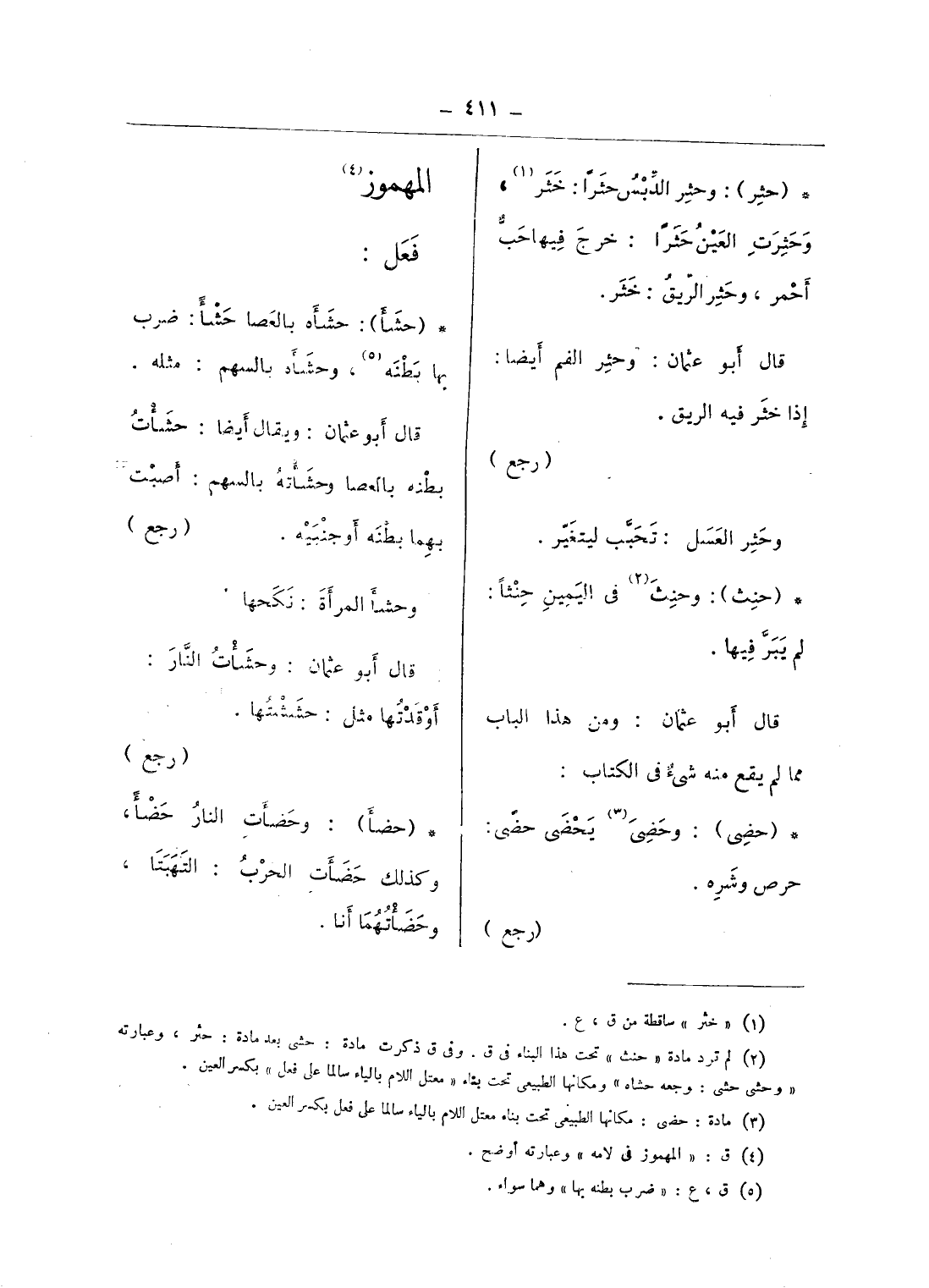 (¬2) لم ترد مادة «حنث» تحت هذا البناء فى ق. وفى ق ذكرت مادة: حشى بعد مادة: حثر، وعبارته «وحشى حشى: وجعه حشاه» ومكانها الطبيعى تحت بناء «معتل اللام بالياء سالما على فعل» بكسر العين.