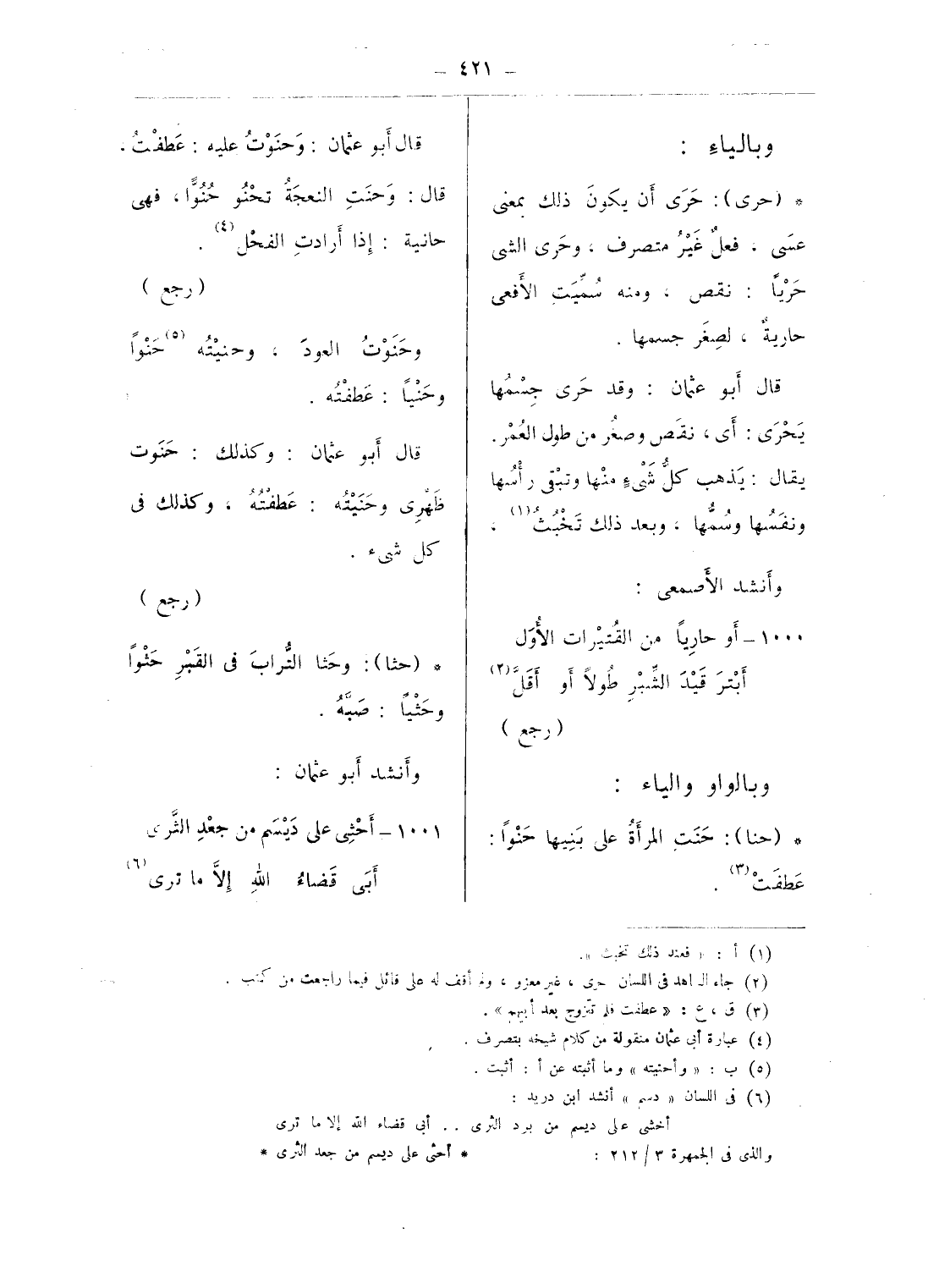 قال أبو عثمان: وحنوت عليه: عطفت، قال: وحنت النعجة تحنو حنوّا، فهى حانية: إذا أرادت الفحل (¬4)