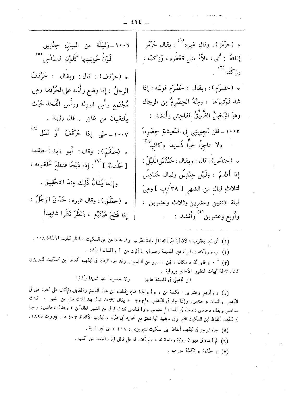 (¬4) «وأربع وعشرين» تكملة من: «أ» بخط قديم يختلف عن خط الناسخ والمقابل. ولم أقف على تحديد لهن فى التهذيب واللسان «حندس» وإنما جاء فى التهذيب 5/ 323 «يقال لثلاث ليال بعد ثلاث ظلم من الشهر: ثلاث حنادس ويقال دحامس، وجاء فى اللسان/ حندس «والحنادس ثلاث ليال من الشهر لظلمتهن، ويقال دحامس، وجاء فى تهذيب ألفاظ ابن السكيت للتبريزى ما يفيد أنها تتفق مع تحديد أبى عثمان، تهذيب الألفاظ 403 ط. بيروت 1895.