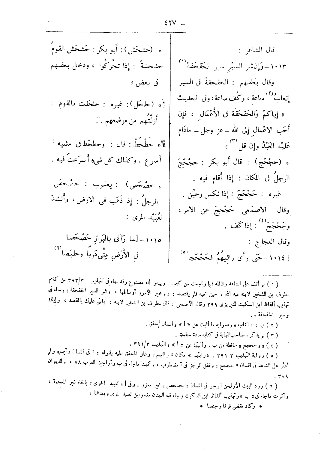 (¬1) لم أقف على الشاهد وقائله فيما راجعت من كتب. ويبدو أنه مصنوع وقد جاء فى التهذيب 3/ 383 من كلام مطرف بن الشخير لابنه عبد الله: حين تعبد فلم يقتصد: «وخير الأمور أوساطها، وشر السير الحقحقة» وجاء فى تهذيب ألفاظ ابن السكيت للتبريزى 299 وقال الأصمعى: قال مطرف بن الشخير لابنه: يا بنى عليك بالقصد، وإياك وسير الحقحقة».