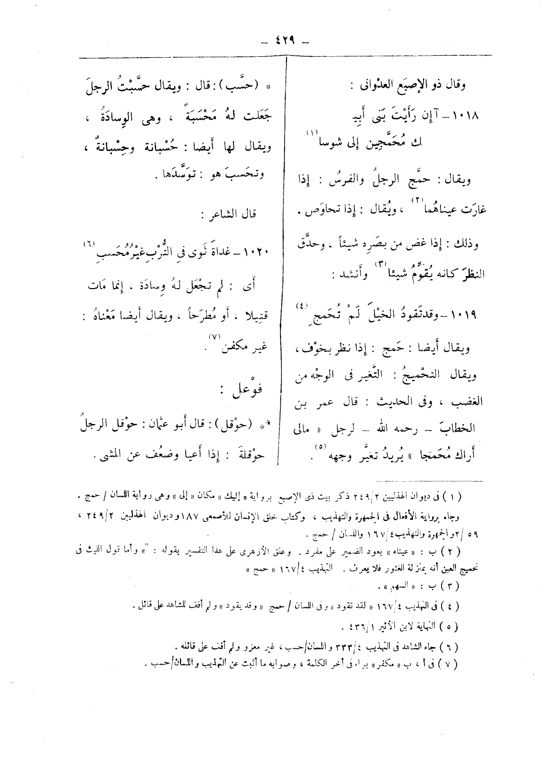 (¬1) فى ديوان الهذليين 2/ 249 ذكر بيت ذى الإصبع برواية «إليك» مكان «إلى» وهى رواية اللسان/ حمج.