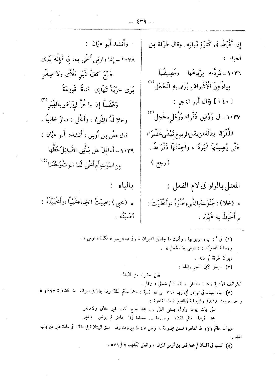 (¬3) جاء البيتان فى نوادر أبى زيد 260 من غير نسبة، وهما لحاتم الطائى وقد جاءا فى ديوانه ط القاهرة 1293 هـ وط بيروت 1868 والرواية فى الديوان ط القاهرة: