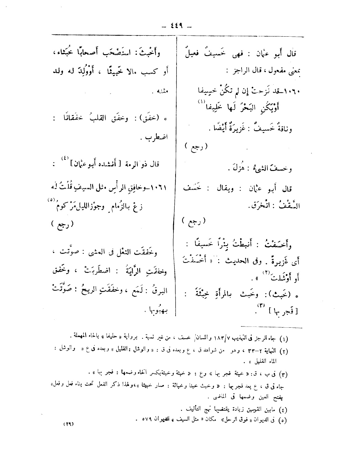 قال أبو عثمان: فهى خسيف فعيل بمعنى مفعول، قال الراجز: