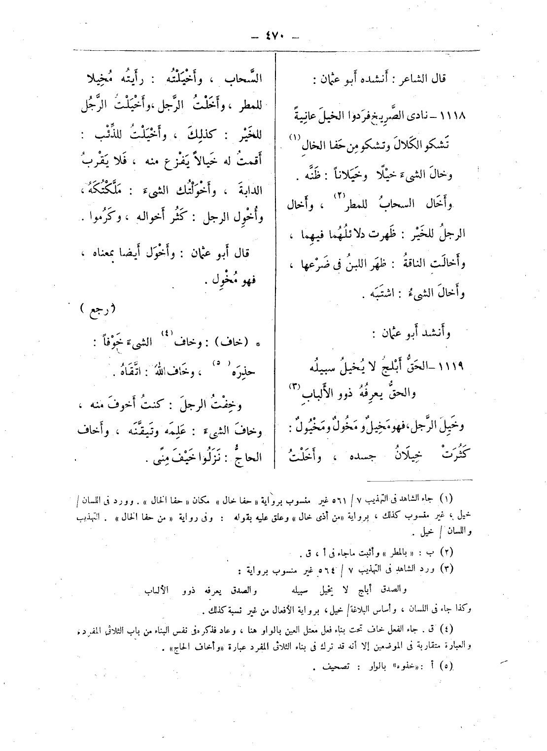 (¬4) ق. جاء الفعل خاف تحت بناء فعل معتل العين بالواو هنا، وعاد فذكره فى نفس البناء من باب الثلاثى المفرد، والعبارة متقاربة فى الموضعين إلا أنه قد ترك فى بناء الثلاثى المفرد عبارة «وأخاف الحاج».