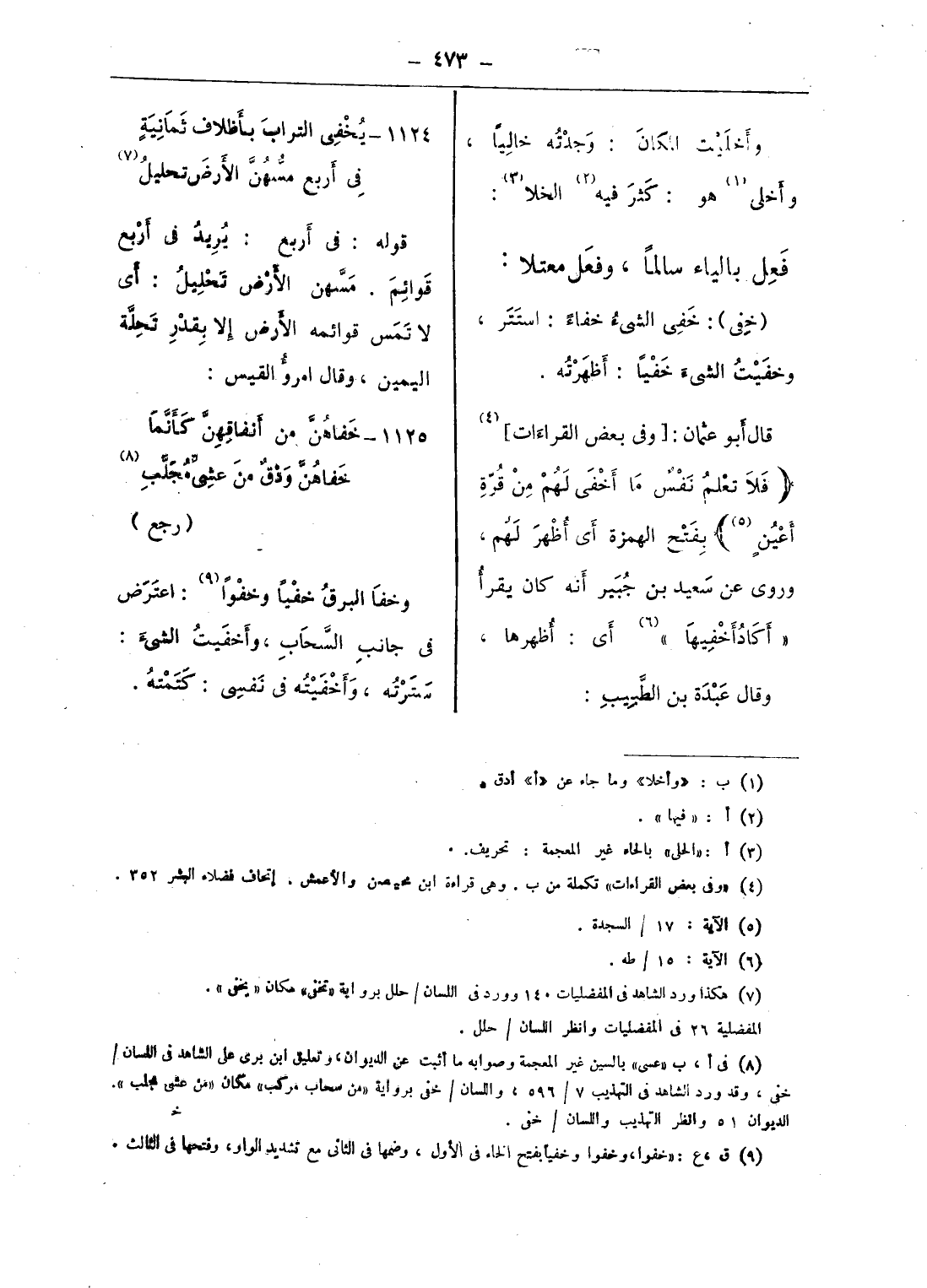 (¬7) هكذا ورد الشاهد فى المفضليات 140 وورد فى اللسان/ حلل برواية «تخفى» مكان «يخفى».