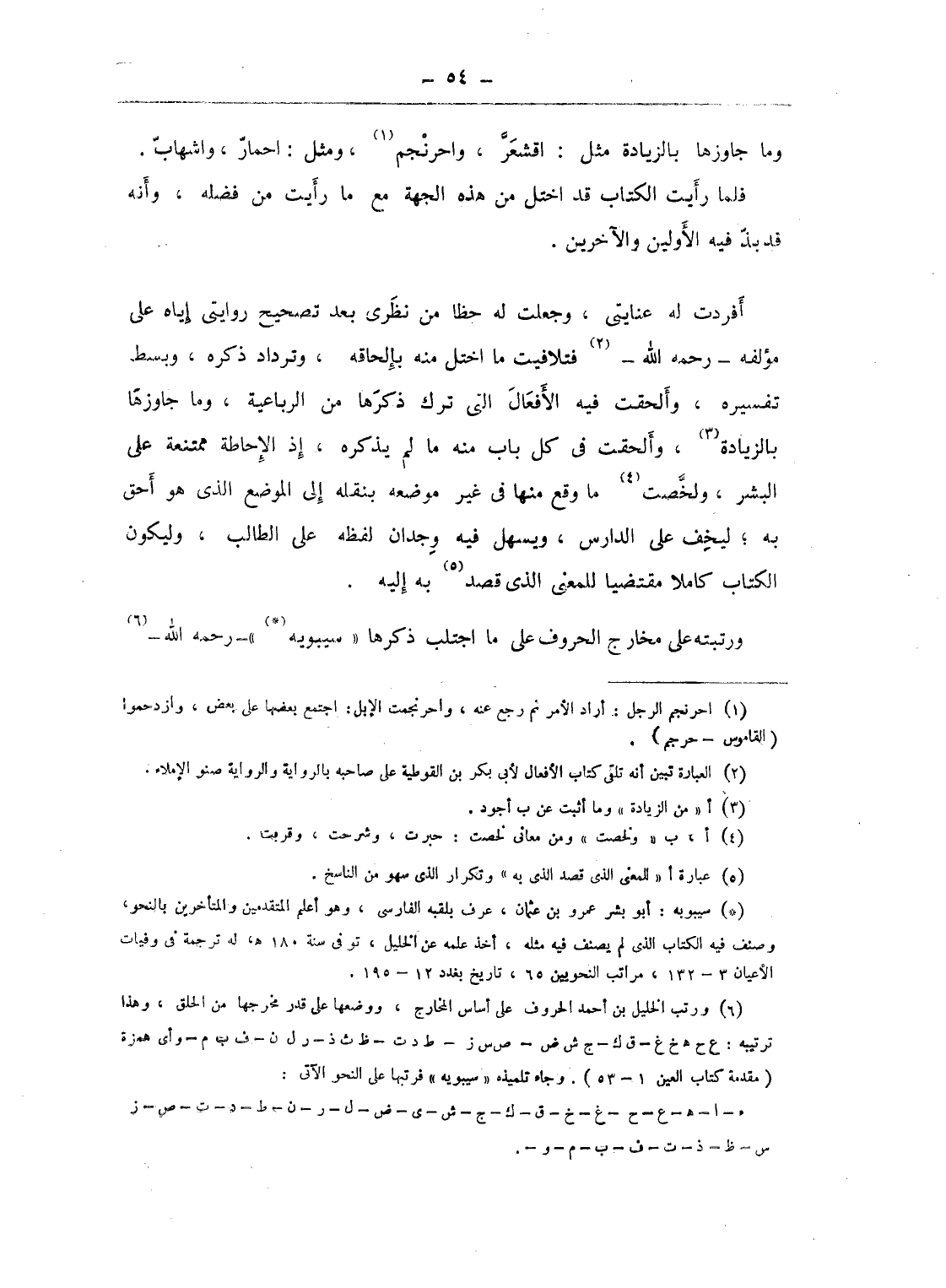 (*) سيبويه: أبو بشر عمرو بن عثمان، عرف بلقبه الفارسى، وهو أعلم المتقدمين والمتأخرين بالنحو، وصنف فيه الكتاب الذى لم يصنف فيه مثله، أخذ علمه عن الخليل، توفى سنة 180 هـ، له ترجمة فى وفيات الأعيان 3 - 132، مراتب النحويين 65، تاريخ بغداد 12 - 195.