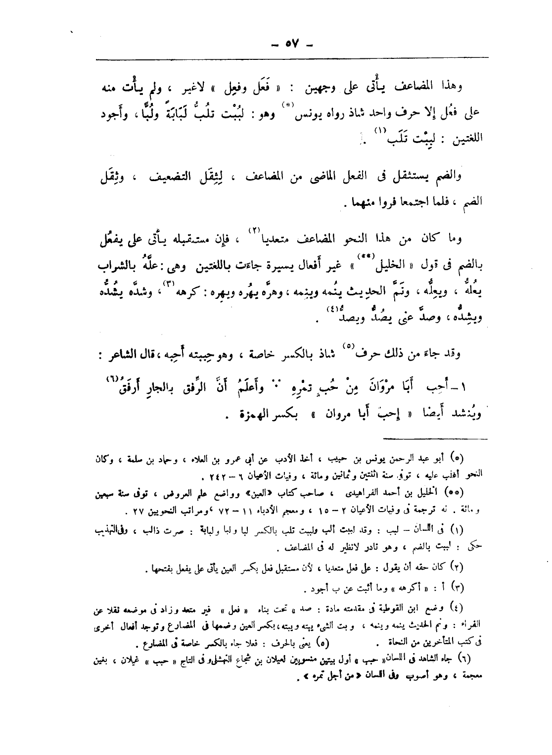 (¬4) وضع ابن القوطية فى مقدمته مادة: صد» تحت بناء «فعل» غير متعد وزاد فى موضعه نقلا عن الفراء: ونم الحديث ينمه وينمه، وبت الشئ يبته ويبته، بكسر العين وضمها فى المضارع وتوجد أفعال أخرى فى كتب المتأخرين من النحاة.