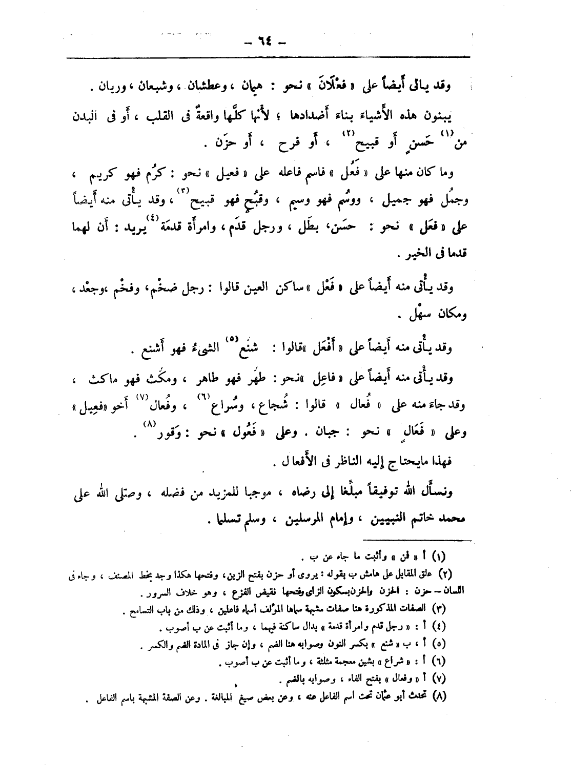 (¬3) الصفات المذكورة هنا صفات مشبهة سماها المؤلف أسماء فاعلين، وذلك من باب التسامح.