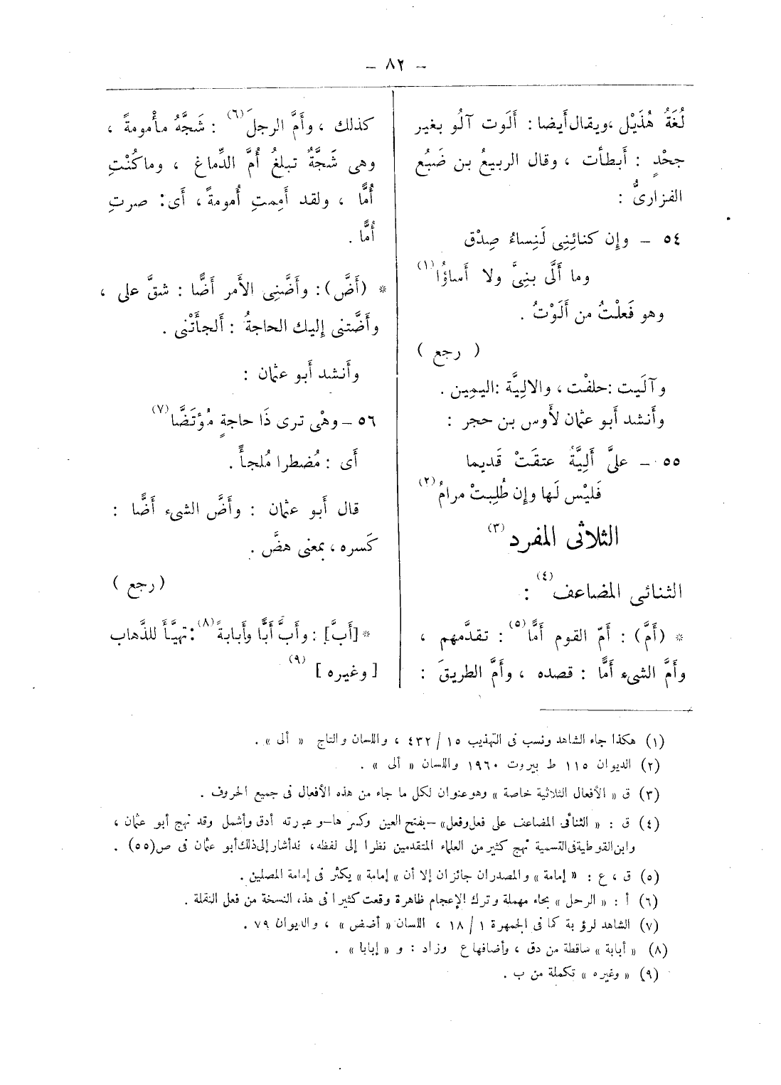 (¬4) ق: «الثنائى المضاعف على فعل وفعل» - بفتح العين وكسرها - وعبارته أدق وأشمل وقد نهج أبو عثمان، وابن القوطية فى التسمية نهج كثير من العلماء المتقدمين نظرا إلى لفظه، قد أشار إلى ذلك أبو عثمان فى ص (55).