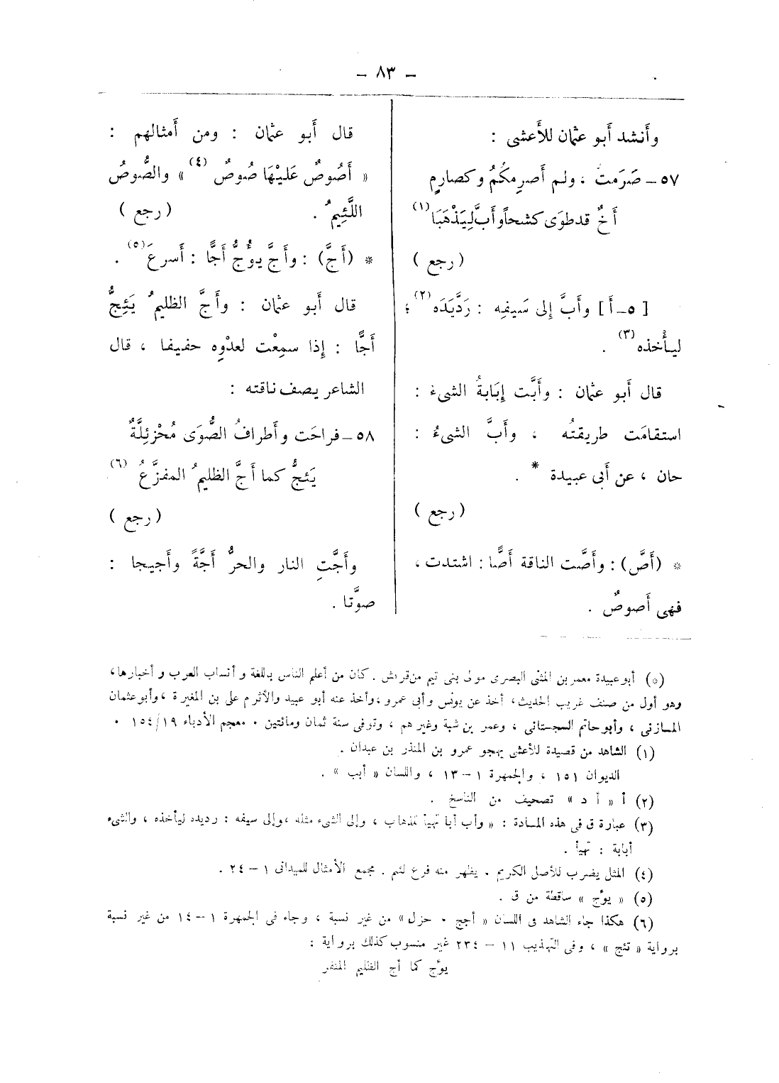 (*) أبو عبيدة معمر بن المثنى البصرى مولى بنى تيم من قريش. كان من أعلم الناس باللغة وأنساب العرب وأخبارها، وهو أول من صنف