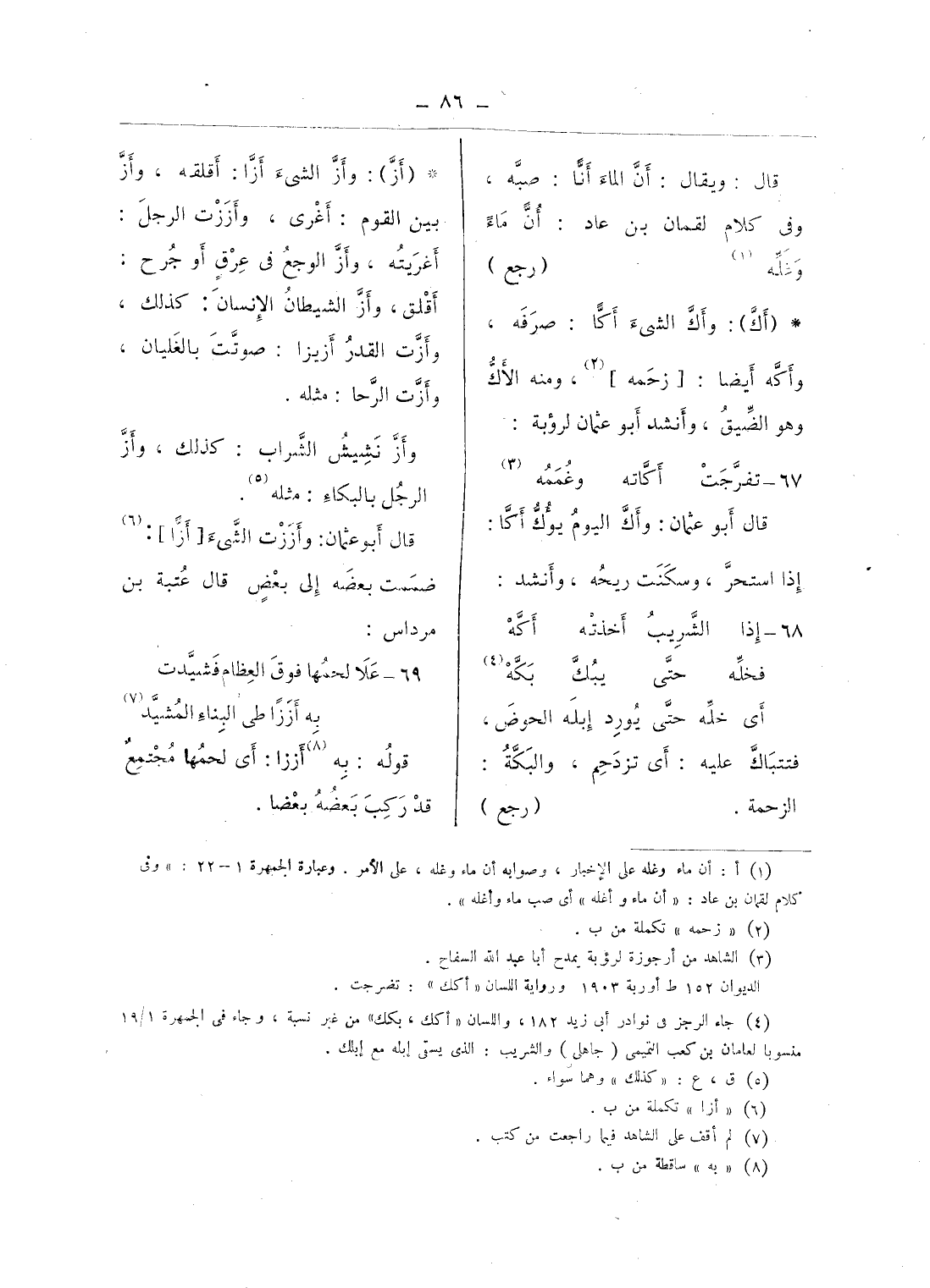 (¬1) أ: أن ماء وغله على الإخبار، وصوابه أن ماء وغله، على الأمر. وعبارة الجمهرة 1 - 22:» وفى كلام لقمان بن عاد: «أن ماء وأغله» أى صب ماء وأغله».
