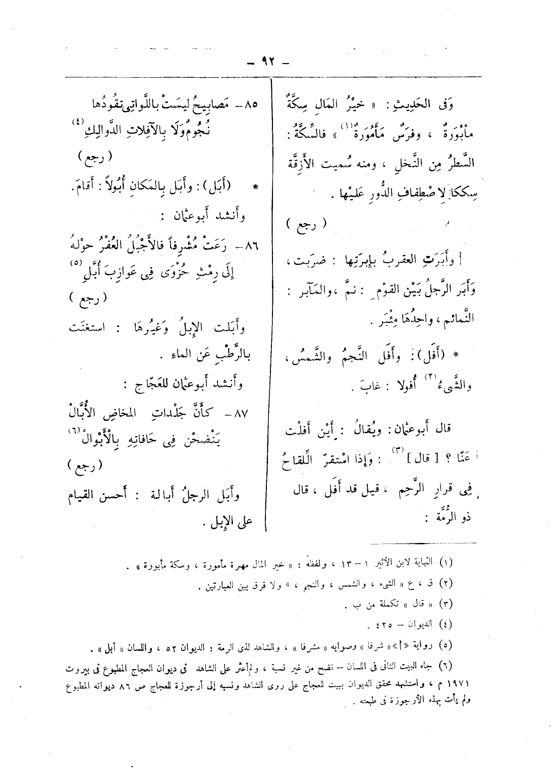 (¬6) جاء البيت الثانى فى اللسان - نضح من غير نسبة، ولم أعثر على الشاهد فى ديوان العجاج المطبوع فى بيروت 1971 م، واستشهد محقق الديوان ببيت للعجاج على روى الشاهد ونسبه إلى أرجوزة للعجاج ص 86 ديوانه المطبوع ولم يأت بهذه الأرجوزة فى طبعته.