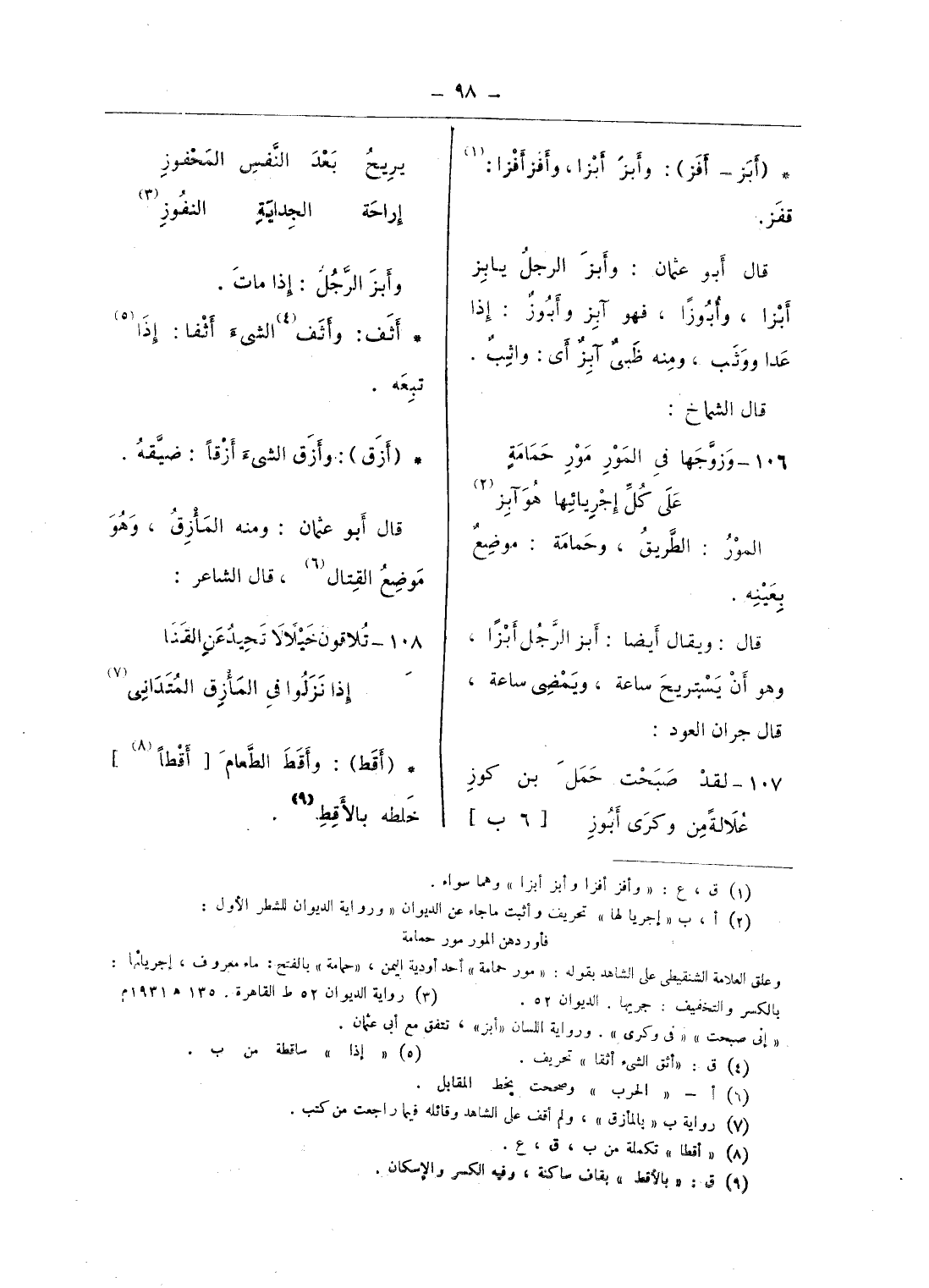 (¬3) رواية الديوان 52 ط القاهرة. 135 هـ 1931 م «إنى صبحت» «فى وكرى». ورواية اللسان «أبز»، تتفق مع أبى عثمان.