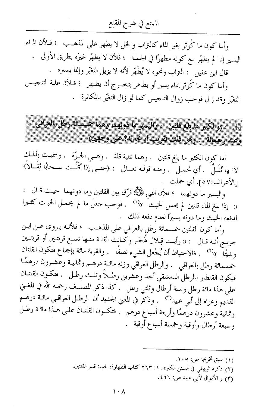 وأما كون القلتين خمسمائة رطلٍ بالعراقي على المذهب؛ فلأنه يروى عن ابن جريج أنه قال: «رأيت قِلال هَجَر وكانت القلة منها تسع قربتين أو قربتين وشيئًا» (¬2). فالاحتياط أن يُجْعل الشيء نصفًا. والقربة مائة بإجماع فتكون القلتان خمسمائة رطل بالعراقي. والرطل العراقي وزنه مائة درهم وثمانية وعشرون درهمًا فيكون القنطار بالرطل الدمشقي أحد وعشرين رطلاً وثلث رطل. فتكون القلتان على هذا مائة رطل وستة أرطال وثلثي رطل. كذا ذكر المصنف رحمه الله في المغني القديم وعزاه إلى أبي عبيد (¬3). وذكر في المغني الجديد أن الرطل العراقي مائة درهم وثمانية وعشرون درهمًا وأربعة أسباع درهم. فتكون القلتان على هذا مائة رطل وسبعة أرطال وأوقية وخمسة أسباع أوقية.
