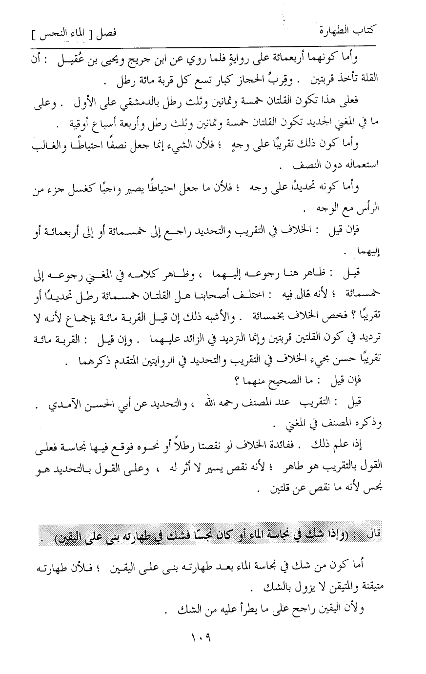قيل: ظاهر هنا رجوعه إليهما، وظاهر كلامه في المغني رجوعه إلى خمسمائة؛ لأنه قال فيه: اختلف أصحابنا هل القلتان خمسمائة رطل تحديدًا أو تقريبًا؟ فخص الخلاف بخمسائة. والأشبه ذلك إن قيل القربة مائة بإجماع لأنه لا ترديد في كون القلتين قربتين وإنما الترديد في الزائد عليهما. وإن قيل: القربة مائة تقريبًا حسن مجيء الخلاف في التقريب والتحديد في الروايتين المتقدم ذكرهما.