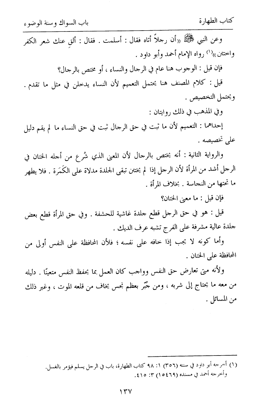 وعن النبي - صلى الله عليه وسلم - «أن رجلاً أتاه فقال: أسلمت. فقال: ألقِ عنك شعر الكفر واختتن» (¬1) رواه الإمام أحمد وأبو داود.