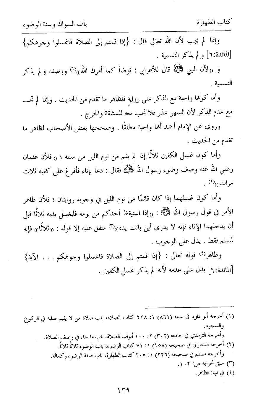 وظاهر (¬4) قوله تعالى: {إذا قمتم إلى الصلاة فاغسلوا وجوهكم ... الآية} [المائدة: 6] يدل على عدمه لأنه لم يذكر غسل الكفين.