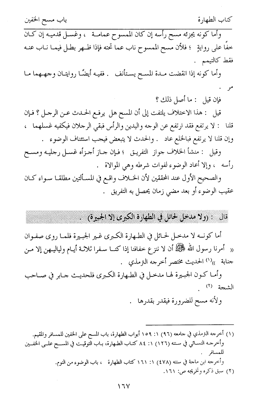 (¬1) أخرجه الترمذي في جامعه (96) 1: 159 أبواب الطهارة، باب المسح على الخفين للمسافر والمقيم.