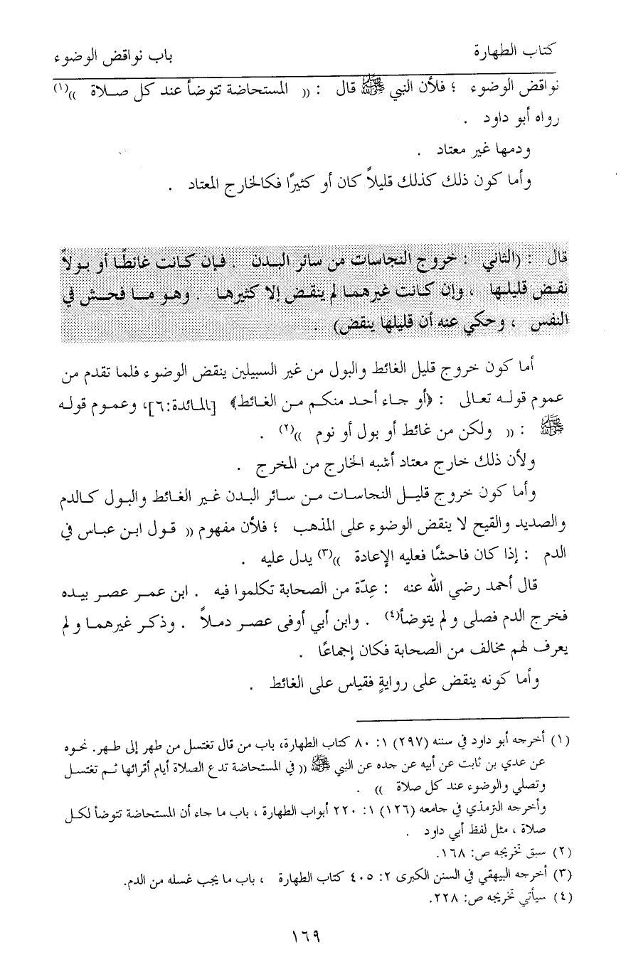 وأما كون خروج قليل النجاسات من سائر البدن غير الغائط والبول كالدم والصديد والقيح لا ينقض الوضوء على المذهب؛ فلأن مفهوم «قول ابن عباس في الدم: إذا كان فاحشًا فعليه الإعادة» (¬3) يدل عليه.