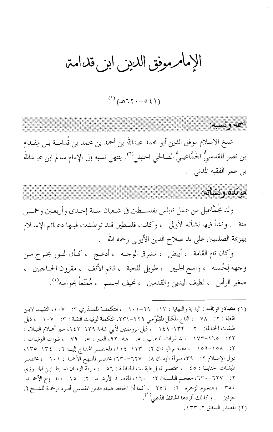 شيخ الاسلام موفق الدين أبو محمد عبدالله بن أحمد بن محمد بن قُدامة بن مِقدام بن نصر المقدسيُّ الجَمَّاعيليُّ الصالحي الحنبلي (¬2). ينتهي نسبه إلى الإمام سالم ابن عبدالله بن عمر الفقيه المدني.