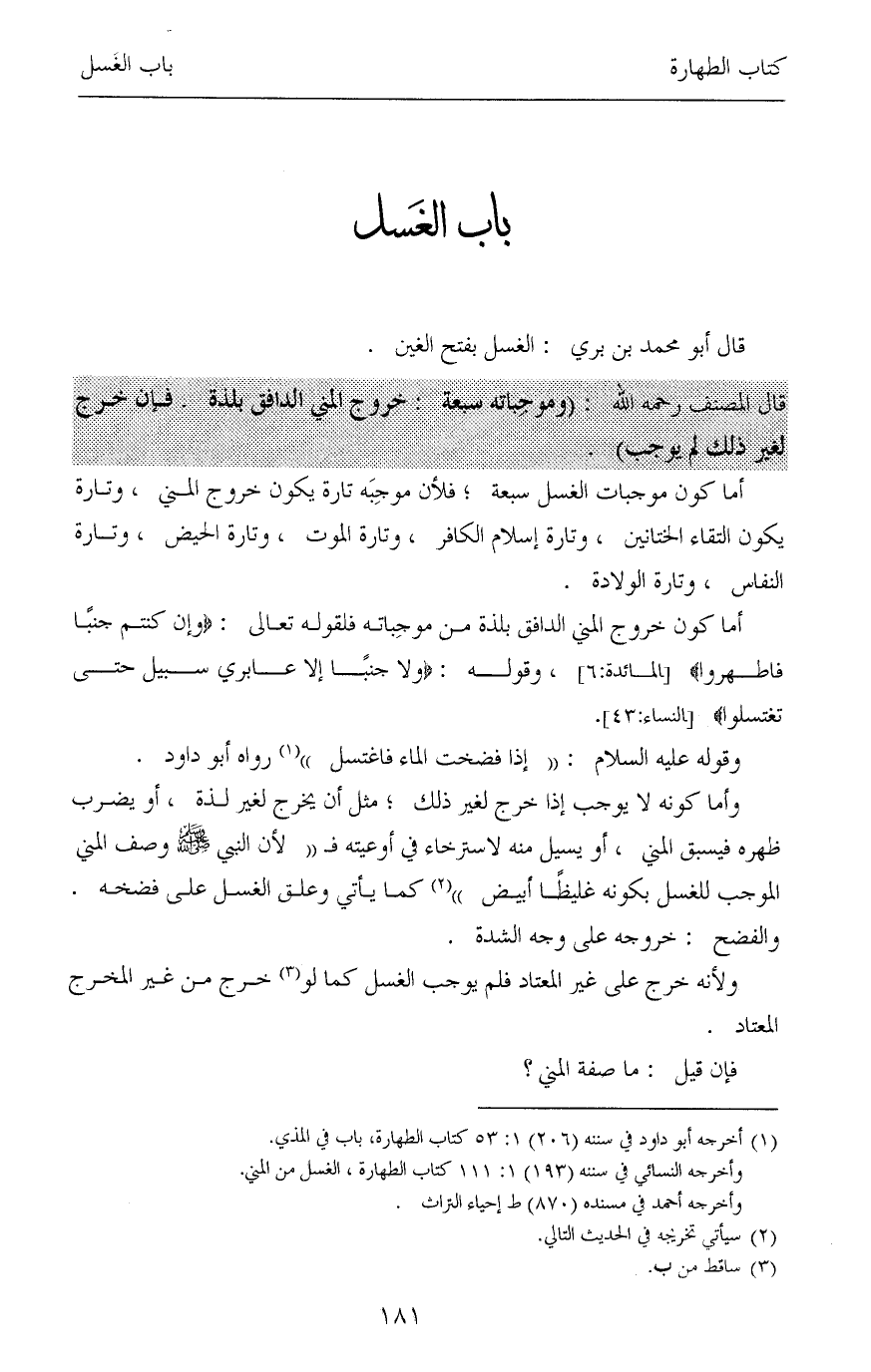 أما كون خروج المني الدافق بلذة من موجِباته فلقوله تعالى: {وإن كنتم جنبًا فاطهروا} [المائدة: 6]، وقوله: {ولا جنبًا إلا عابري سبيل حتى تغتسلوا} [النساء: 43].