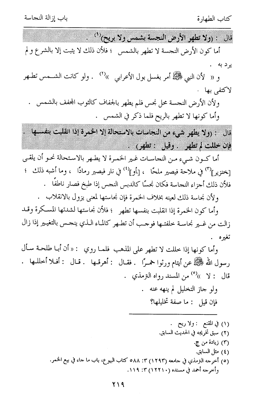 وأما كونها إذا خللت لا تطهر على المذهب فلما روي: «أن أبا طلحة سأل رسول الله - صلى الله عليه وسلم - عن أيتام ورثوا خمرًا. فقال: أهرقها. قال: أفلا أخللها. قال: لا» (¬5) من المسند رواه الترمذي.
