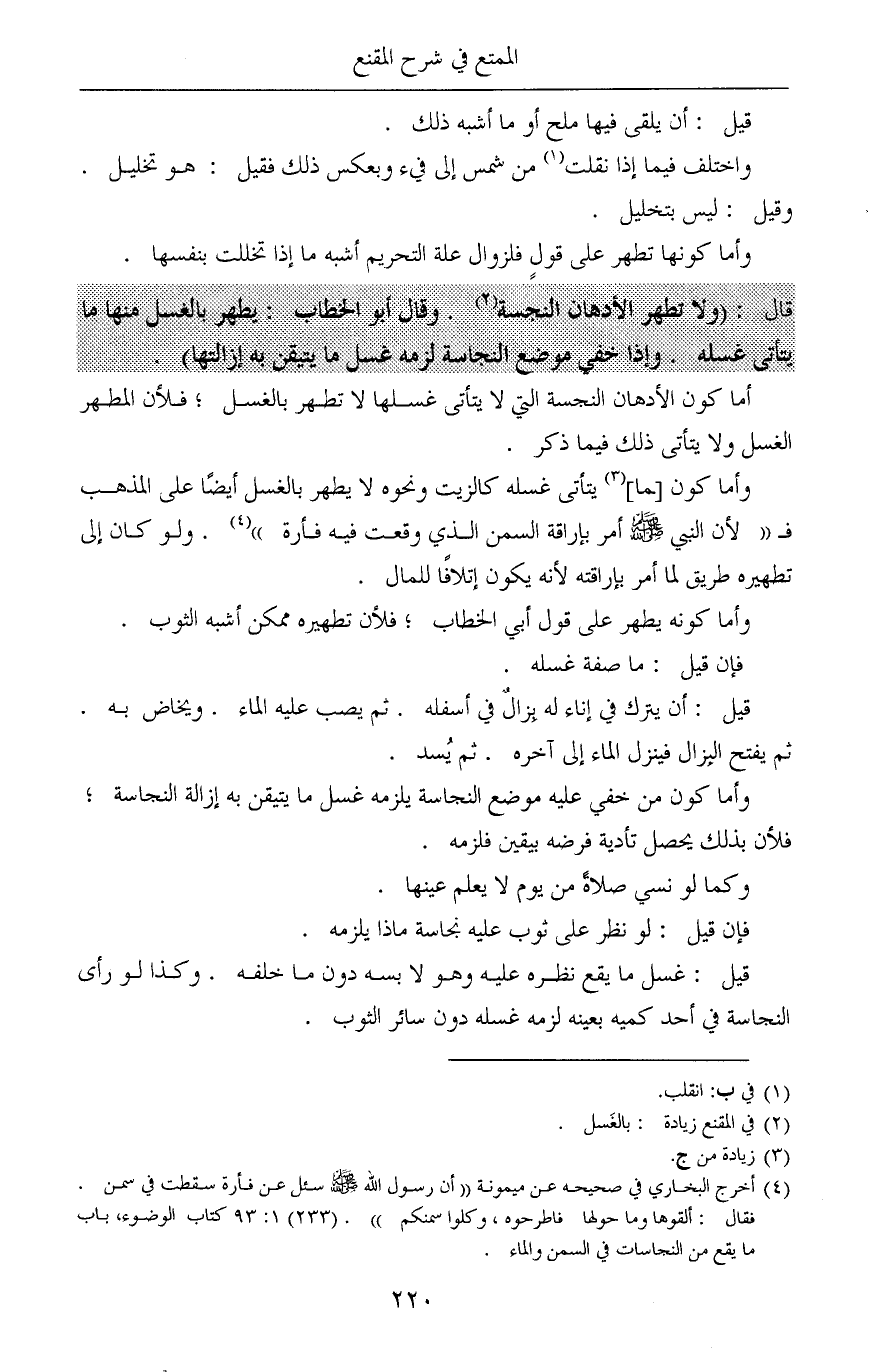 (¬4) أخرج البخاري في صحيحه عن ميمونة «أن رسول الله - صلى الله عليه وسلم - سئل عن فأرة سقطت في سمن. فقال: ألقوها وما حولها فاطرحوه، وكلوا سمنكم». (233) 1: 93 كتاب الوضوء، باب ما يقع من النجاسات في السمن والماء.