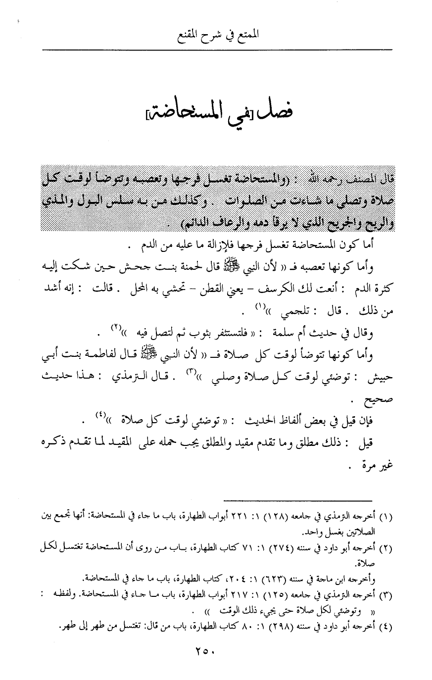 (¬3) أخرجه الترمذي في جامعه (125) 1: 217 أبواب الطهارة، باب ما جاء في المستحاضة. ولفظه: «وتوضئي لكل صلاة حتى يجيء ذلك الوقت».