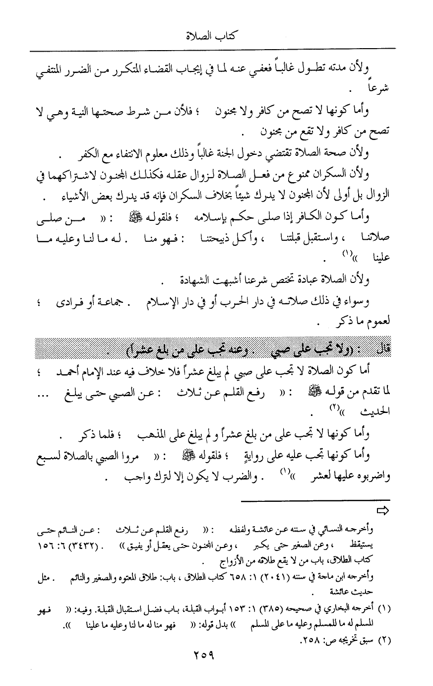 أما كون الصلاة لا تجب على صبي لم يبلغ عشراً فلا خلاف فيه عند الإمام أحمد؛ لما تقدم من قوله صلى الله عليه وسلم: «رفع القلم عن ثلاث: عن الصبي حتى يبلغ ... الحديث» (¬2).
