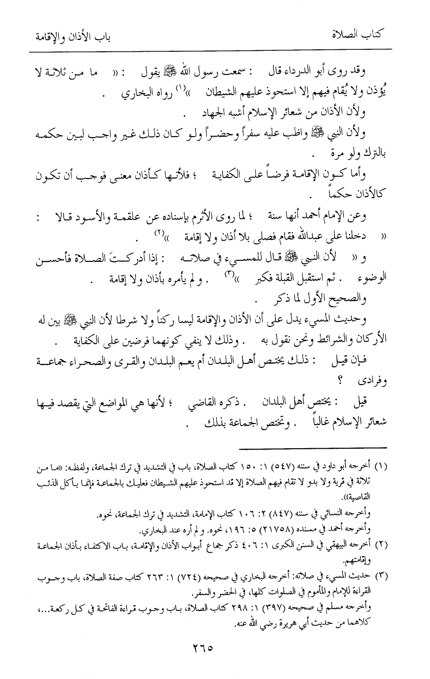 وقد روى أبو الدرداء قال: سمعت رسول الله صلى الله عليه وسلم يقول: «ما من ثلاثة لا يُؤذن ولا يُقام فيهم إلا استحوذ عليهم الشيطان» (¬1) رواه البخاري.