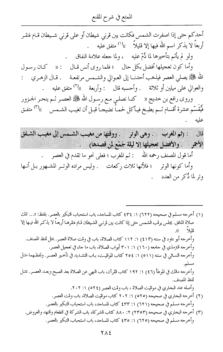 (¬1) أخرجه مسلم في صحيحه (622) 1: 434 كتاب المساجد، باب استحباب التبكير بالعصر. بلفظ: « ... تلك صلاة المنافق. يجلس يرقب الشمس حتى إذا كانت بين قرني الشيطان قام فنقرها أربعاً لا يذكر الله فيها إلا قليلاً».