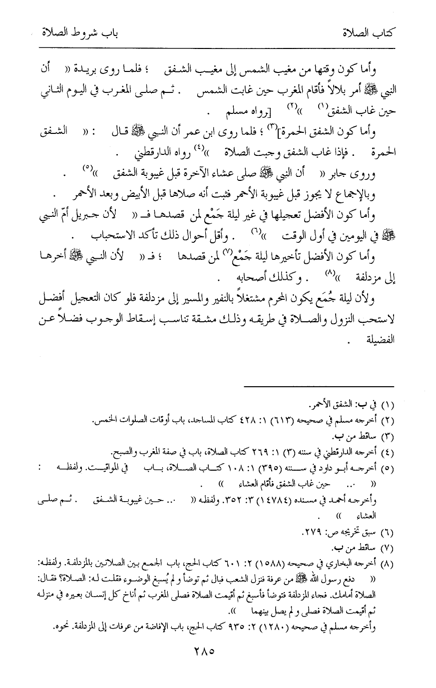 (¬5) أخرجه أبو داود في سننه (395) 1: 108 كتاب الصلاة، باب في المواقيت. ولفظه: « ... حين غاب الشفق فأقام العشاء».