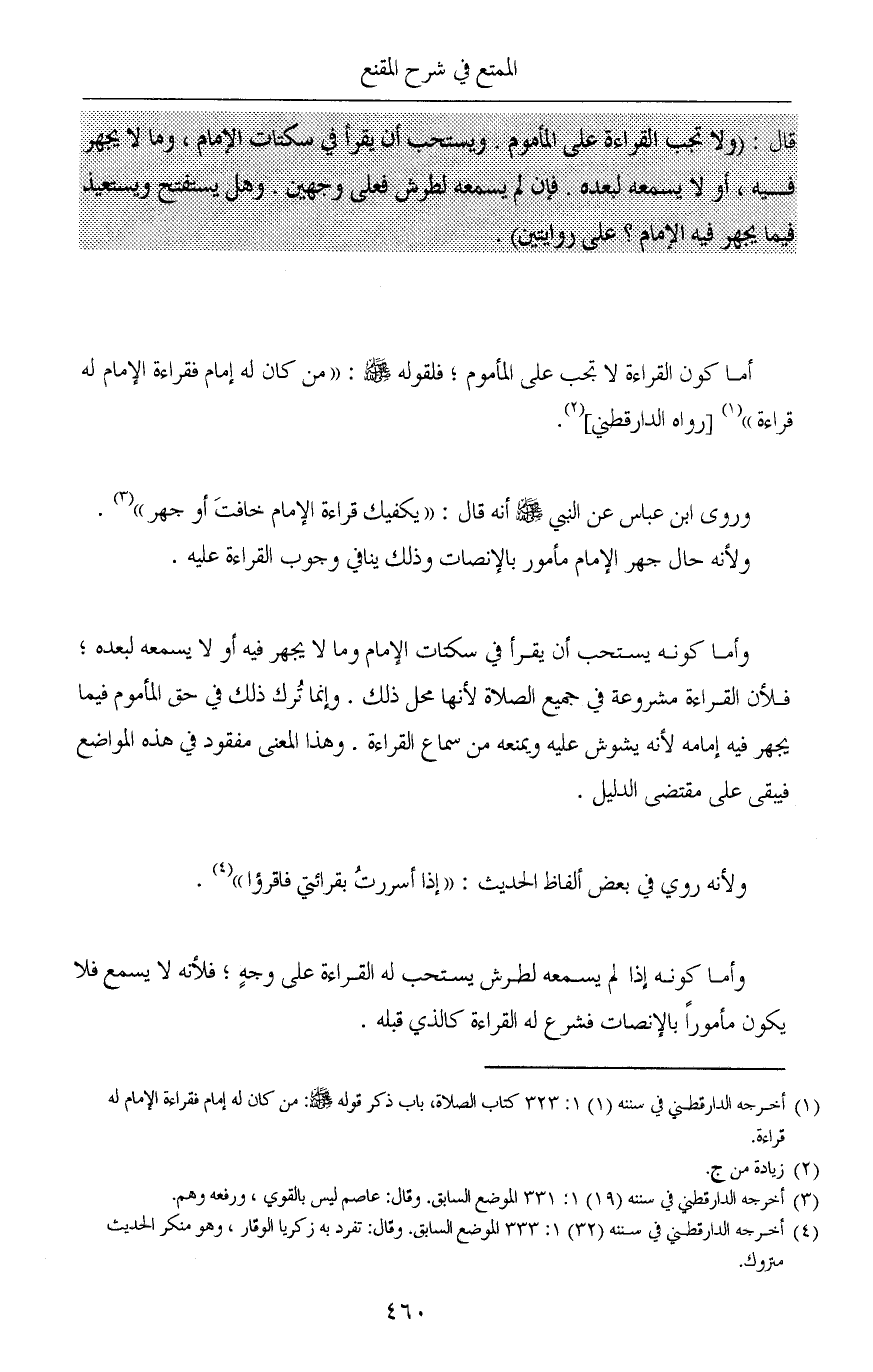 (¬1) أخرجه الدارقطني في سننه (1) 1: 323 كتاب الصلاة، باب ذكر قوله صلى الله عليه وسلم: من كان له إمام فقراءة الإمام له قراءة.