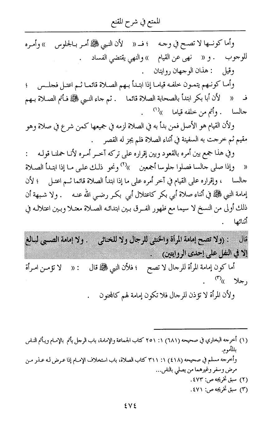 قال: (ولا تصح إمامة المرأة والخنثى للرجال ولا للخناثى. ولا إمامة الصبي لبالغ إلا في النفل على إحدى الروايتين).