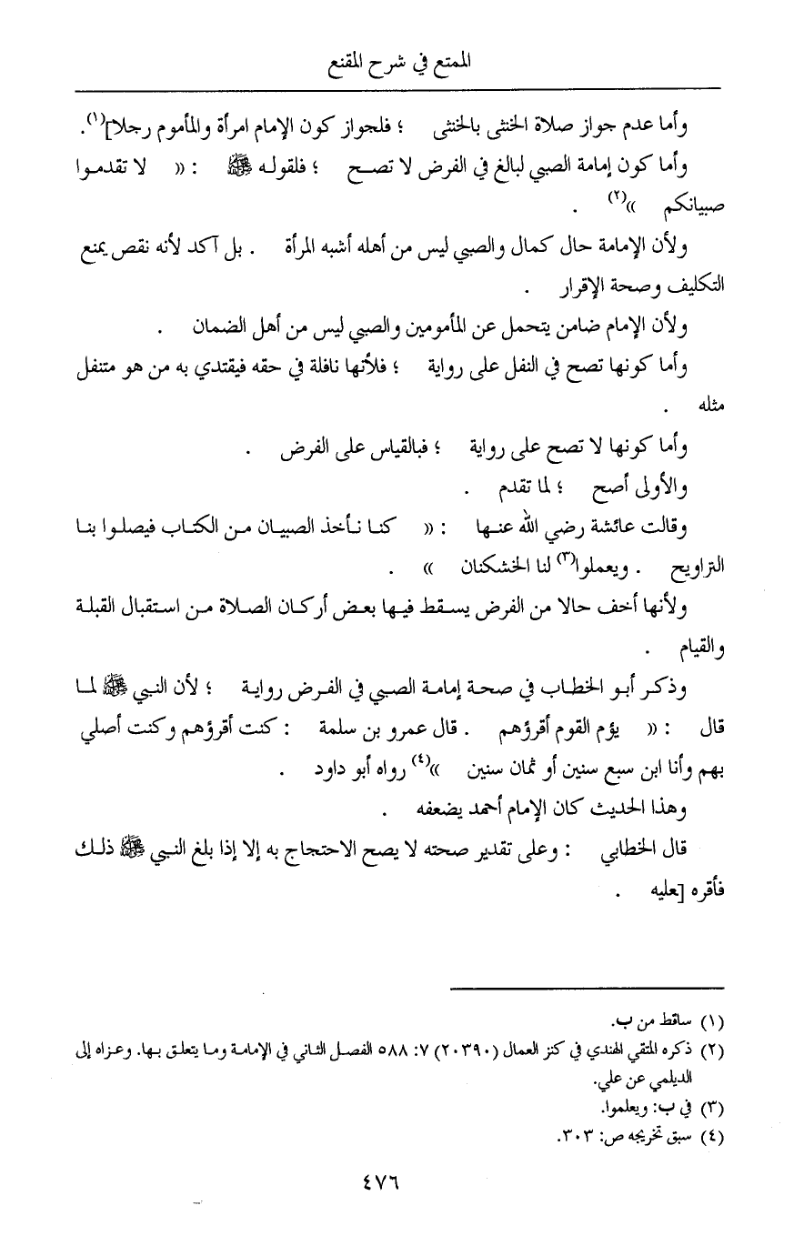 وأما كون إمامة الصبي لبالغ في الفرض لا تصح؛ فلقوله صلى الله عليه وسلم: «لا تقدموا صبيانكم» (¬2).