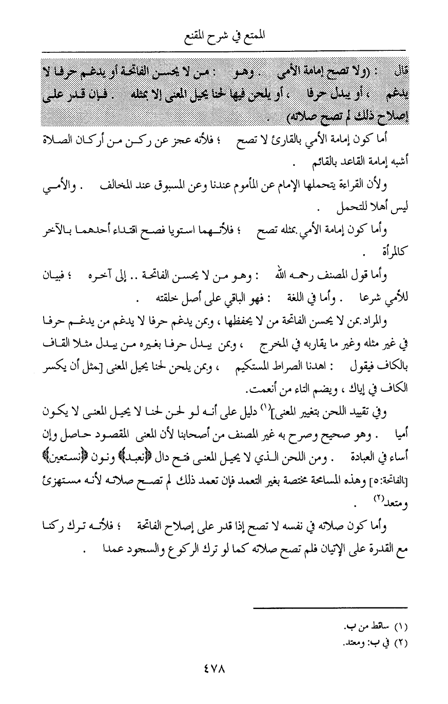 والمراد بمن لا يحسن الفاتحة من لا يحفظها، وبمن يدغم حرفاً لا يُدْغَم من يدغم حرفاً في غير مثله وغير ما يقاربه في المخرج، وبمن يبدل حرفاً بغيره من يبدل مثلاً القاف بالكاف فيقول: اهدنا الصراط المستكيم، وبمن يلحن لحناً يحيل المعنى [مثل أن يكسر الكاف في إياك، ويضم التاء من أنعمت.