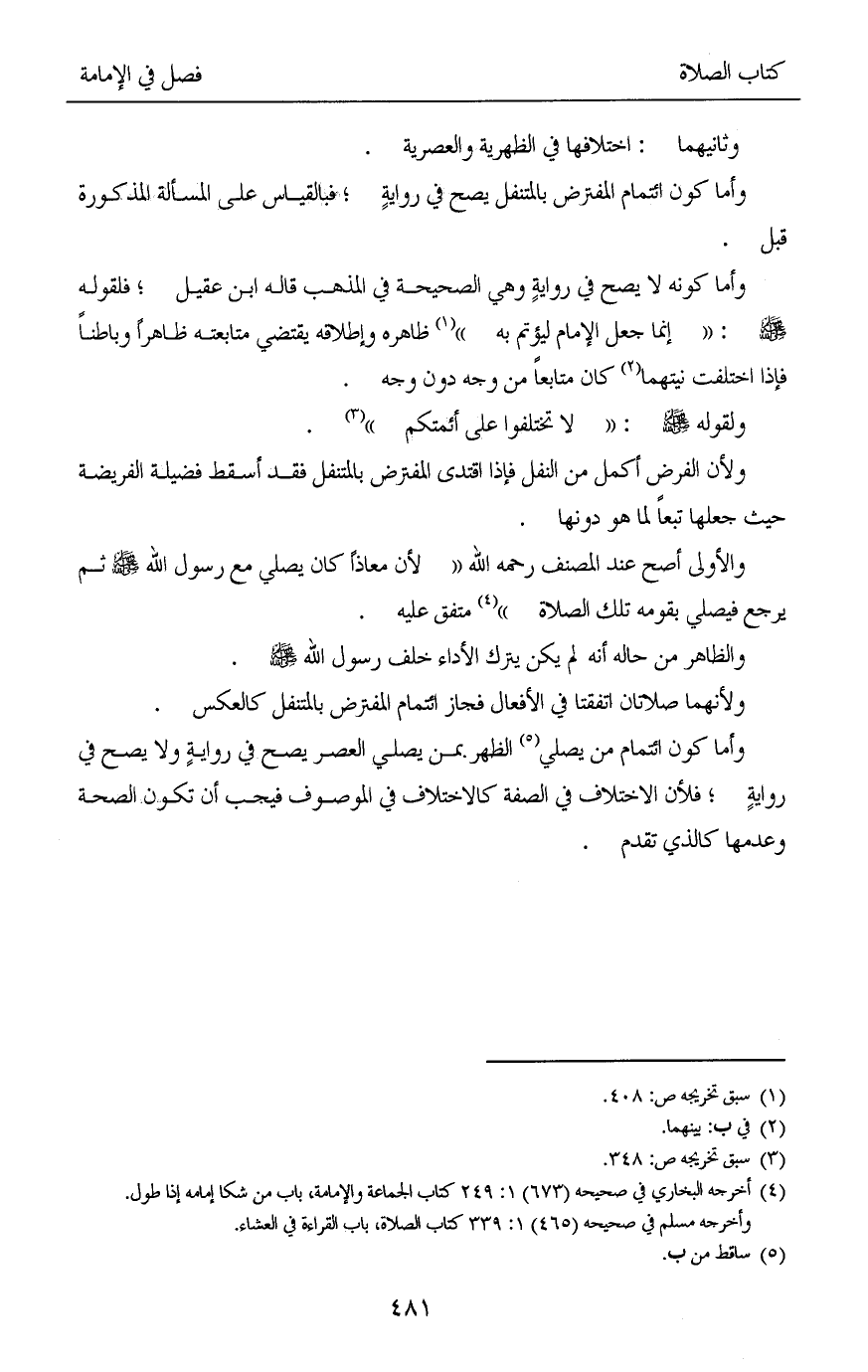 وأما كون ائتمام من يصلي (¬5) الظهر بمن يصلي العصر يصح في روايةٍ ولا يصح في روايةٍ؛ فلأن الاختلاف في الصفة كالاختلاف في الموصوف فيجب أن تكون الصحة وعدمها كالذي تقدم.