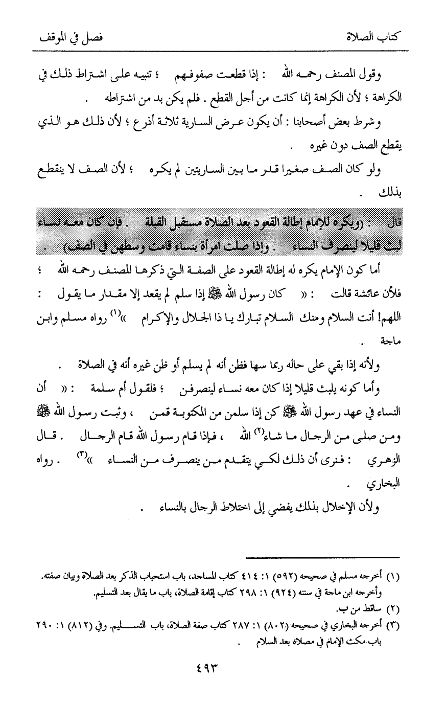 (¬3) أخرجه البخاري في صحيحه (802) 1: 287 كتاب صفة الصلاة، باب التسليم. وفي (812) 1: 290 باب مكث الإمام في مصلاه بعد السلام.